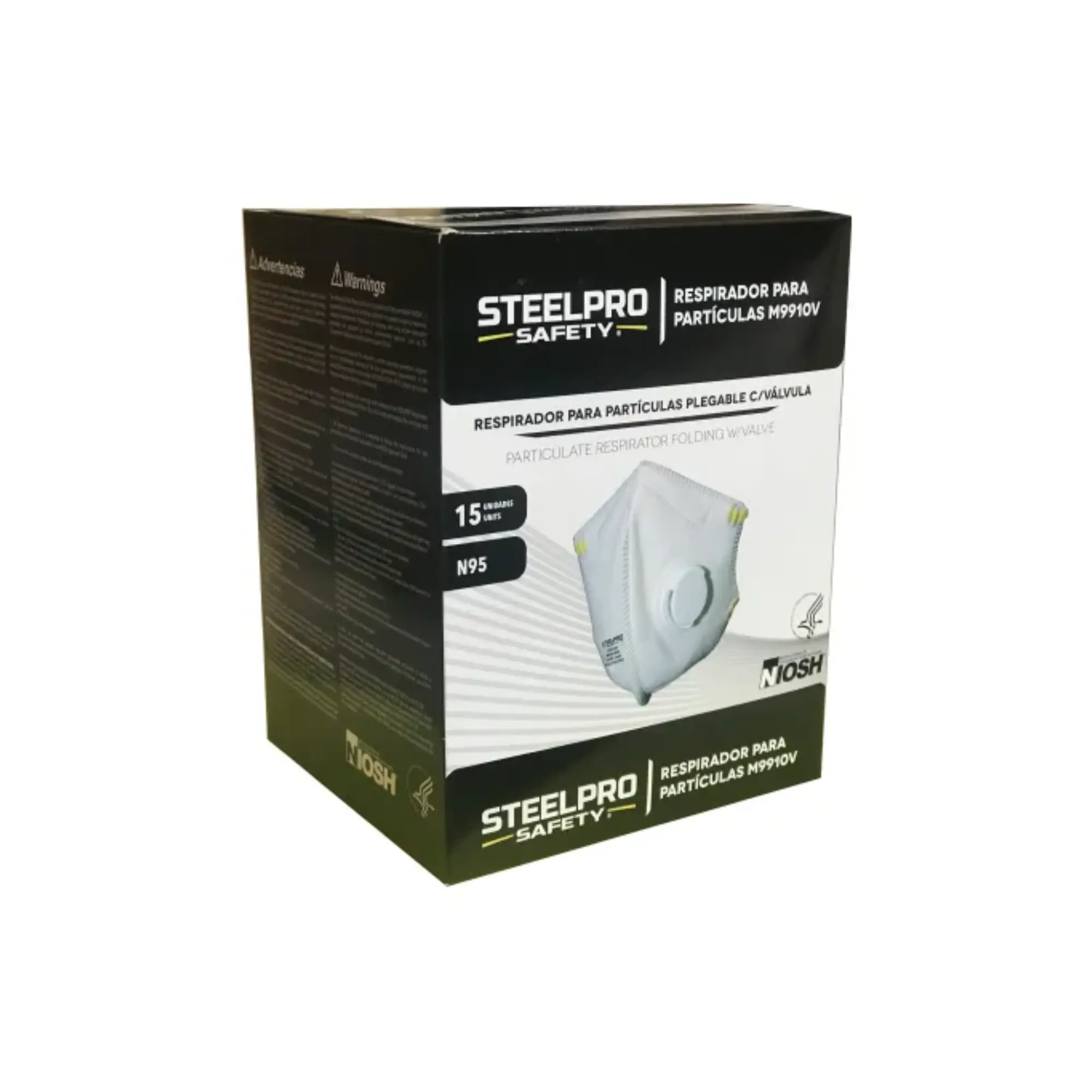 RESPIRADOR PLEGABLE BLANCO C/VALV M9910V N95, VÁLVULA DE EXHALACIÓN PARA MAYOR CONFORT, BANDAS ELÁSTICAS TEXTILES Y CLIP DE AJUSTE NASAL, ESPUMA INTERNA DE AJUSTE NASAL, EMPAQUE X15 UND, CERTIFICADO N95 NIOSH 42CFR84. STEELPRO 501086